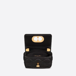 The Dior Caro bag is a creation that combines both modernity and timeless elegance. Crafted in black supple calfskin with Cannage stitching, it features a flap adorned with a ‘CD’ clasp, inspired by the seal of a Christian Dior perfume bottle. The miniature shape’s removable chain shoulder strap has a leather insert that provides a comfortable and adjustable carry, to be worn with day or evening attire.