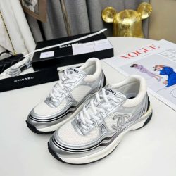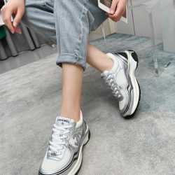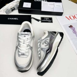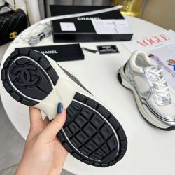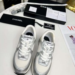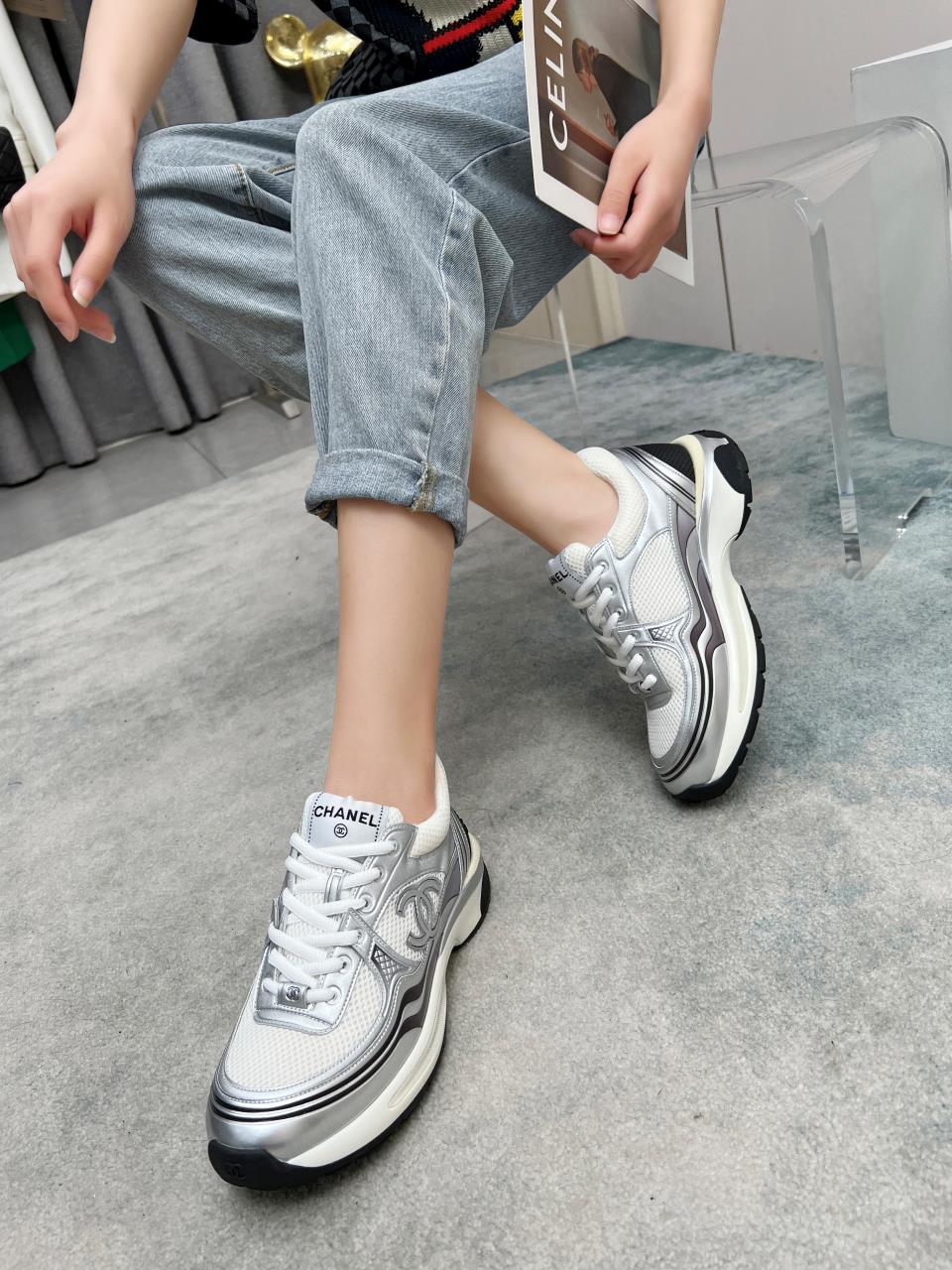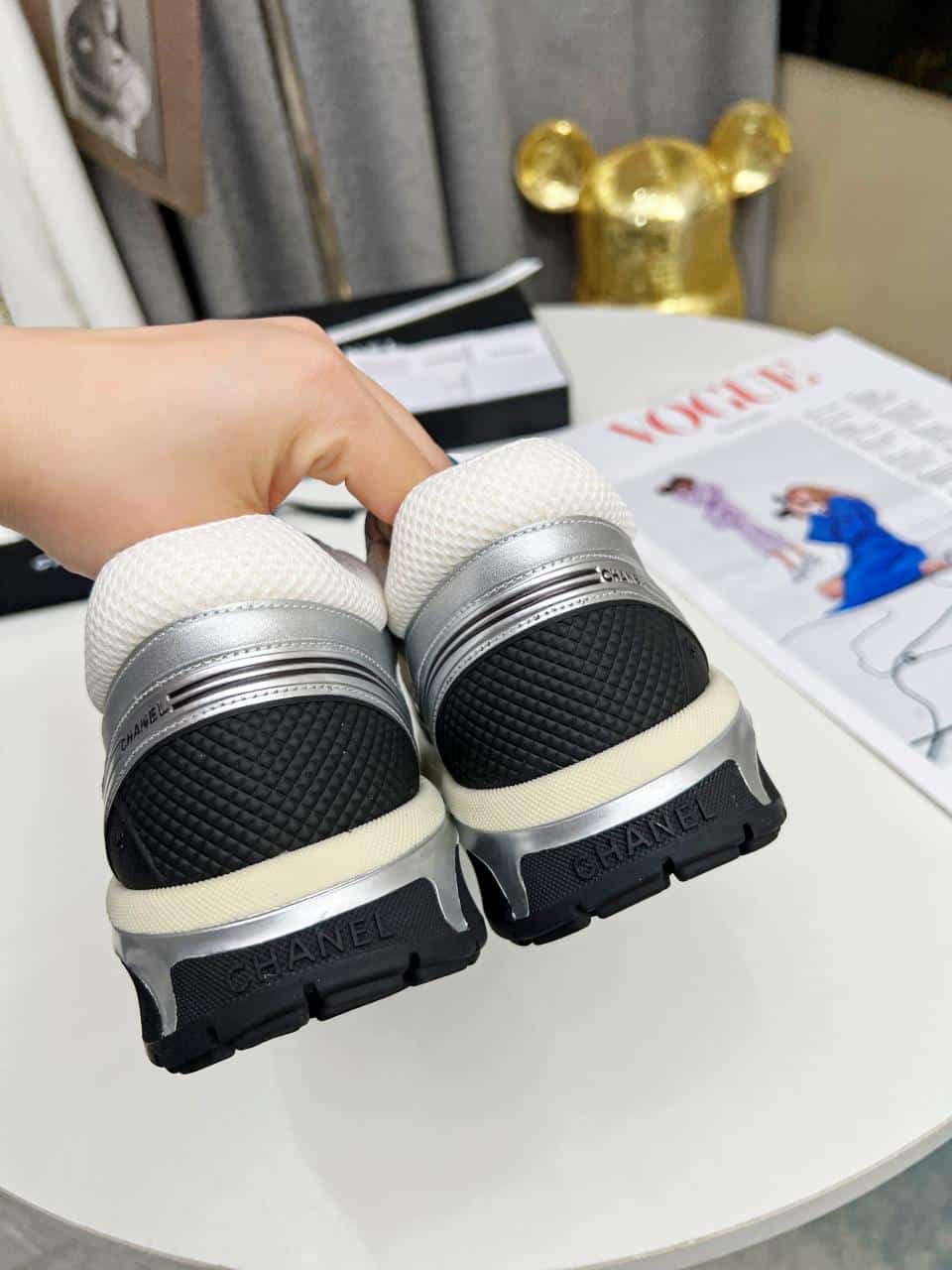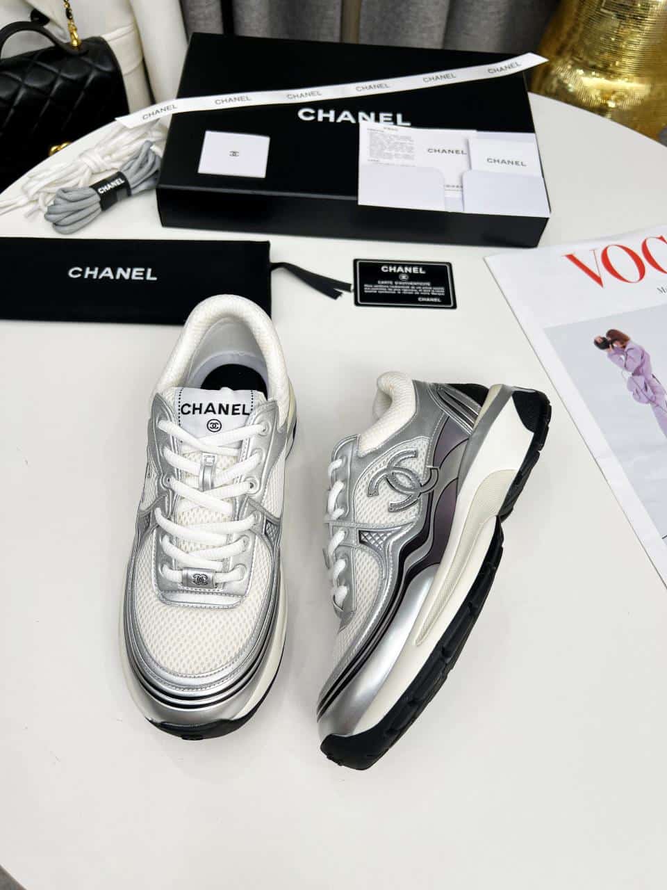 Chanel 23C Silver Metallic Cc Logo Lace Up Flat Runner Trainer Sneaker White G39792 Y56368 K5451