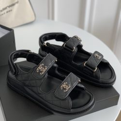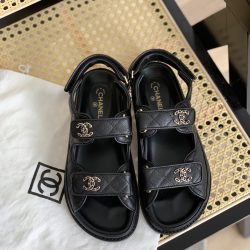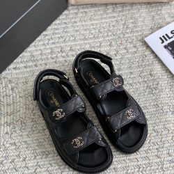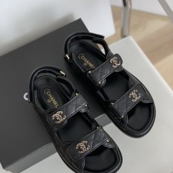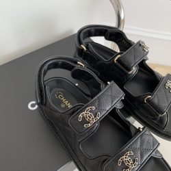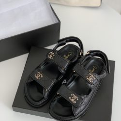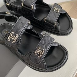 Chanel Cc Button Velcro Black Sandals Grained Calfskin Leather