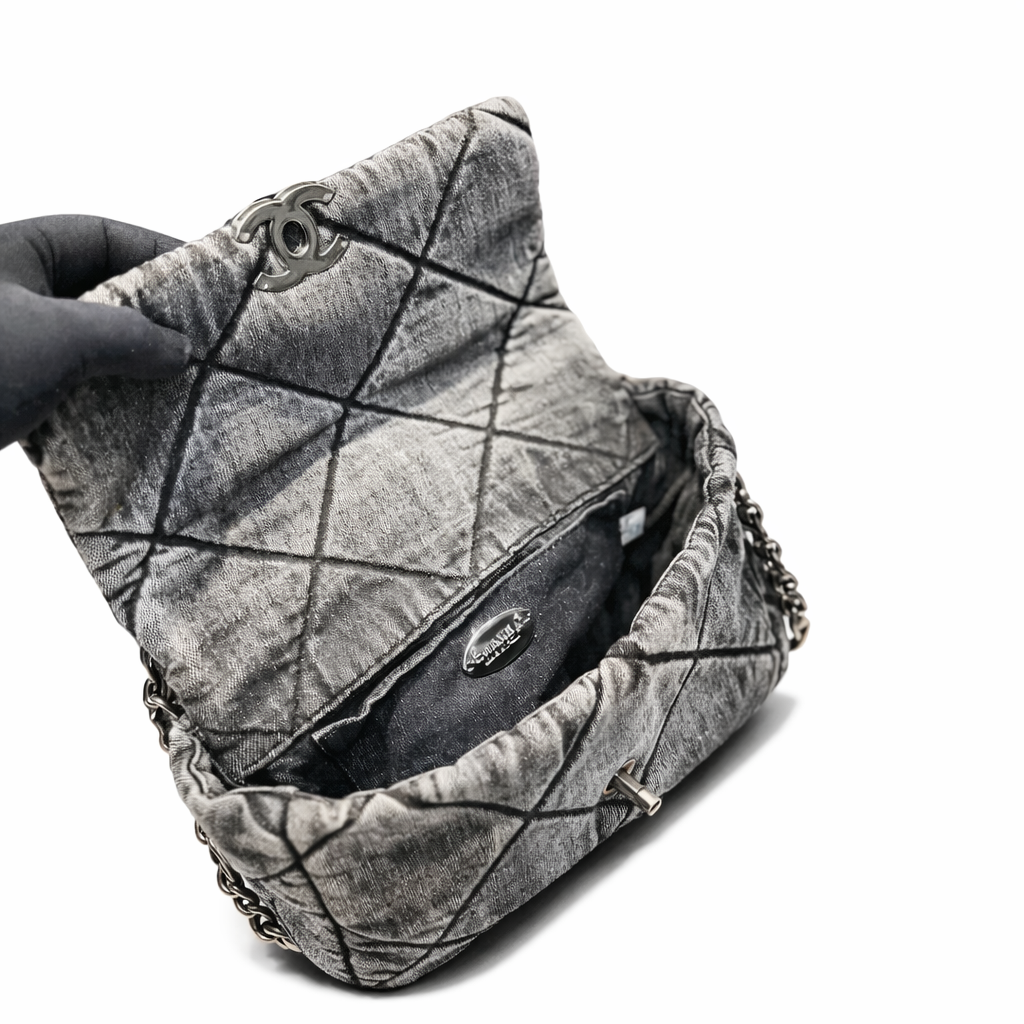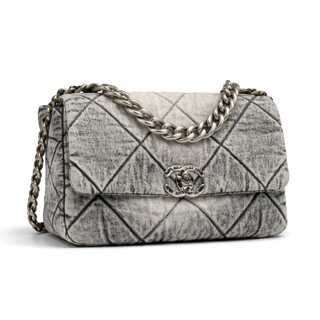 The Chanel 19 Medium Denim Bag in grey is a stylish fusion of classic Chanel design codes with contemporary casual flair. Crafted from grey quilted denim, it features exaggerated puffed quilting and a flap‑front with the interlocking CC twist lock closure. The hardware is mixed‑metal — typically a blend of gold, silver and ruthenium tones — which gives the bag a versatile edge that works with many accessories. It includes both a top handle (short chain/handle) and a longer chain‑and‑woven‑leather strap for shoulder or crossbody wear. The bag also has an external slip pocket on the back, and interior zip pocket plus a split interior for organising essentials. It balances softness and structure — more relaxed than a rigid flap bag but still polished and elegant — making it perfect for both day‑to‑day and dress‑up occasions.