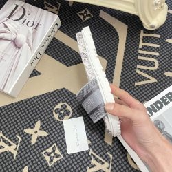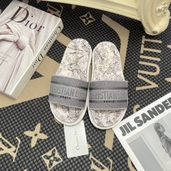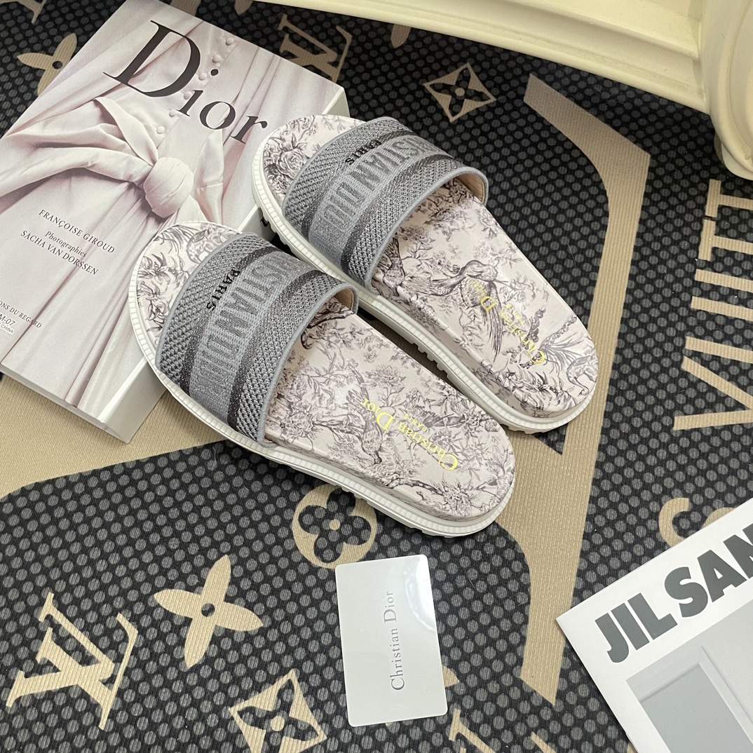Dior Dway Toile De Jouy Embroidered Cotton Slide Sandals Gray