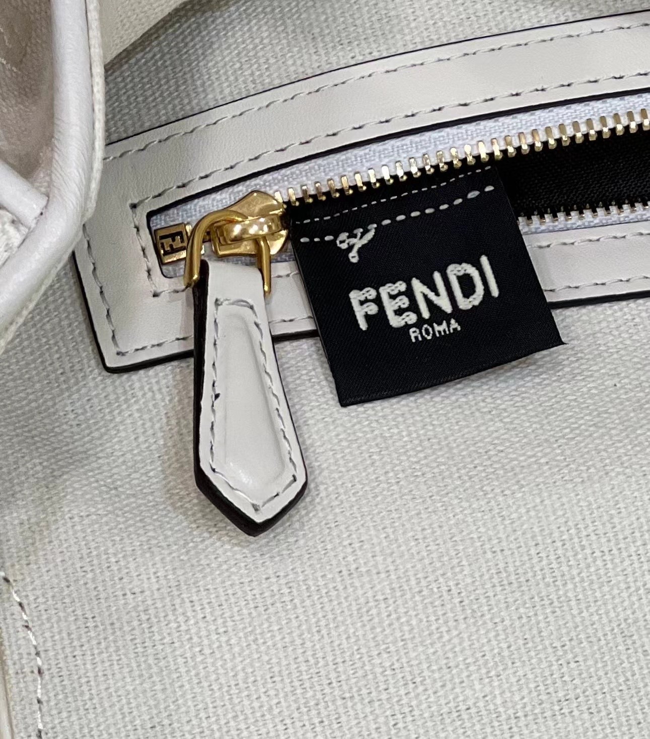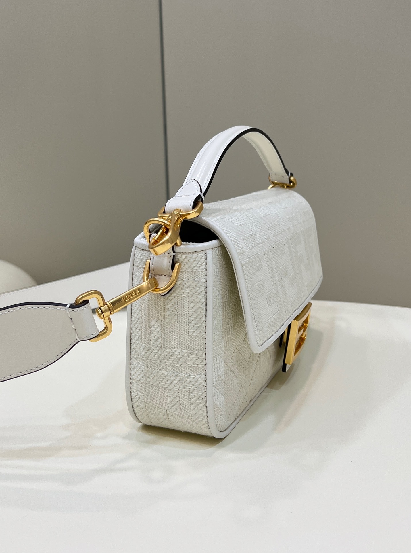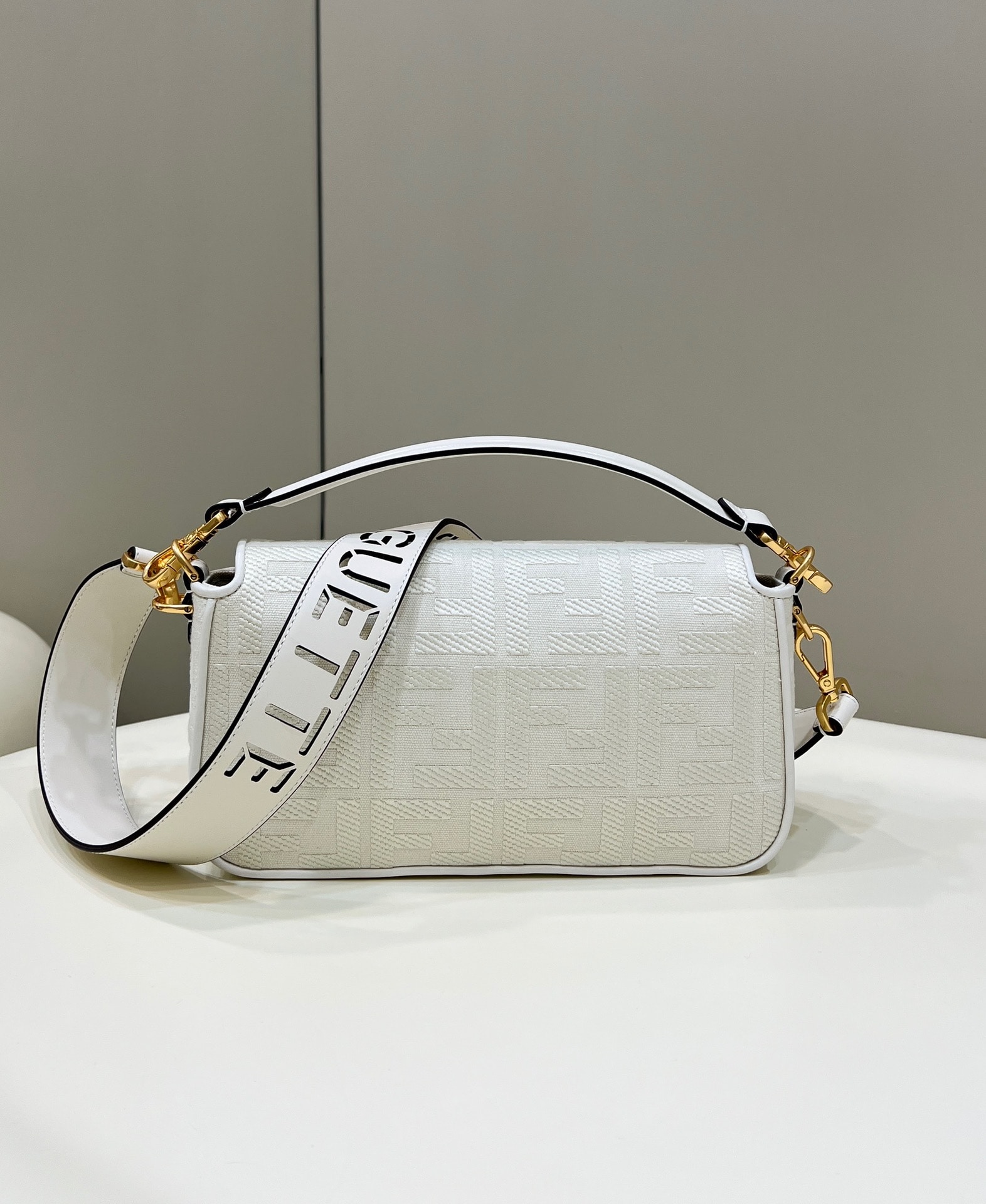 - Baguette bag made of white canvas with an raised FF motif created with tone on tone embroidery, trimmed in matching-colour leather and adorned with an FF clasp.