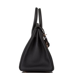 This Birkin is in Black togo leather with rose gold hardware and has tonal stitching,front flap, two straps with center toggle closure, clochette with lock and two keys, and double rolled handles.