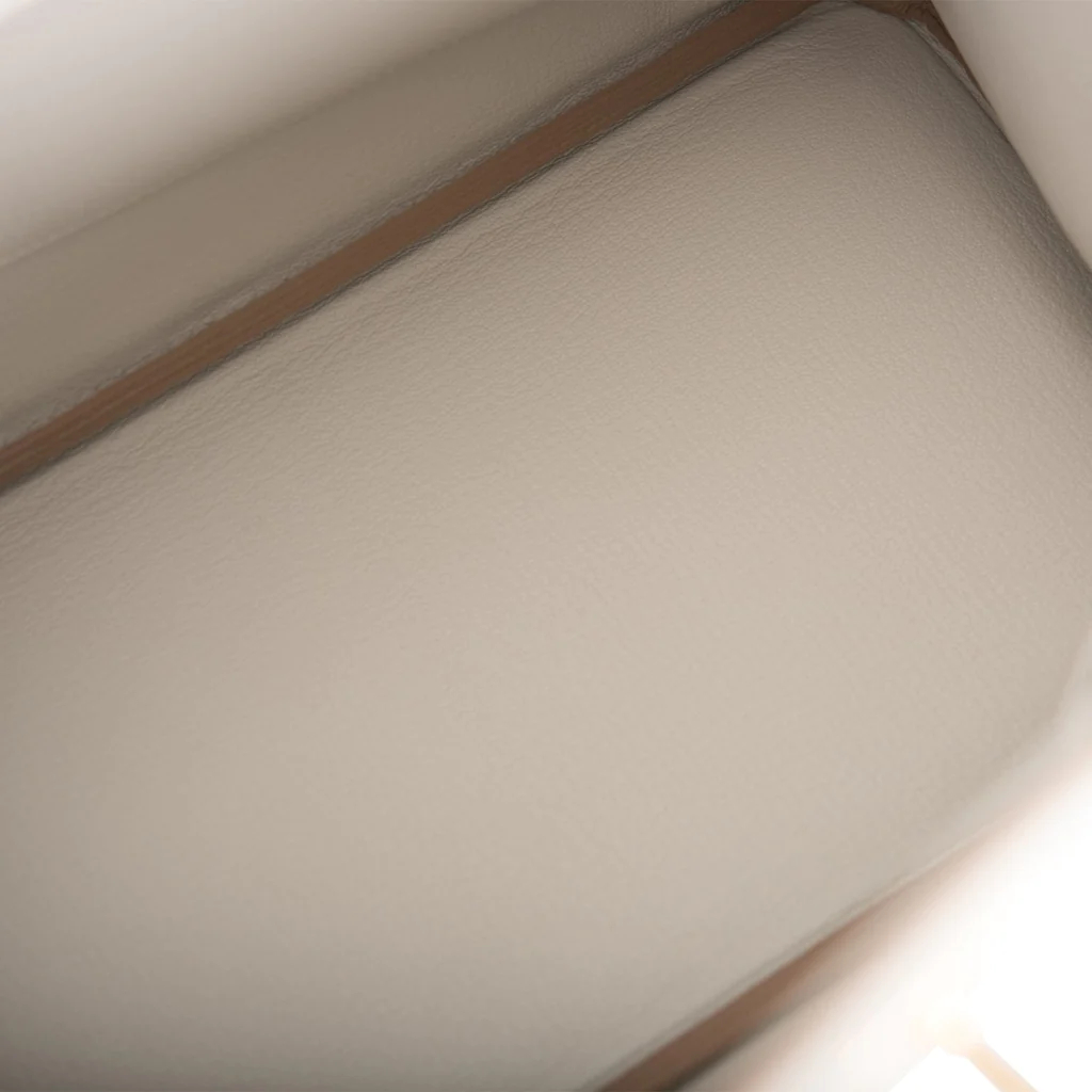 The interior is lined with Gris Perle chevre and has one zip pocket with an Hermes engraved zipper pull and an open pocket on the opposite side.