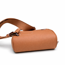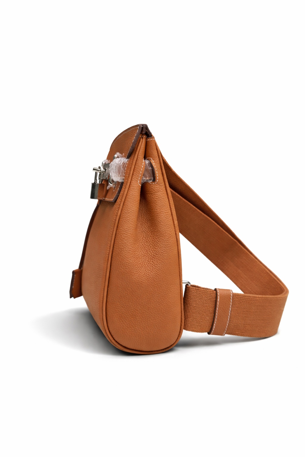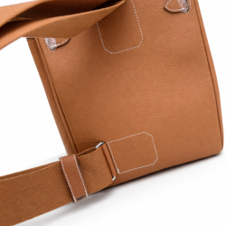 This HAC à Dos PM is crafted from gold Togo leather with palladium hardware, featuring tonal stitching, a front flap with signature turn-lock closure, and an adjustable canvas shoulder strap.