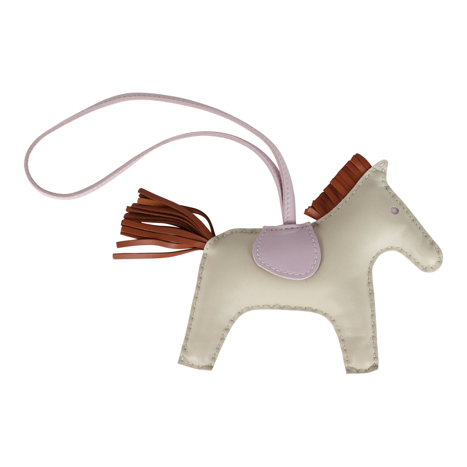 This Rodeo Bag Charm MM is in Craie Milo Lambskin leather and is accented with Mauve Pale eyes, saddle, loop holder, and Gold mane and tail.