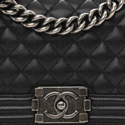 This is an authentic Luxury Caviar Quilted Small Boy Flap in Black. This chic shoulder bag is finely crafted of rich caviar leather with signature diamond stitched quilting in black. The bag features an aged gold chain-link shoulder strap with a leather shoulder pad and a matching Luxury Boy CC press lock on the flap. This opens to a black fabric interior with a small patch pocket.