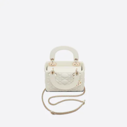 The Lady Dior handbag epitomizes the House’s vision of elegance and beauty. Refined and sleek, the timeless creation is crafted in latte lambskin and covered with Cannage stitching, creating an instantly recognizable quilted texture. The pale gold-finish metal ‘D.I.O.R.’ charms embellish and illuminate its silhouette. Featuring a removable chain shoulder strap, the miniature Lady Dior bag can be carried by hand or worn crossbody as an ideal evening wear companion.