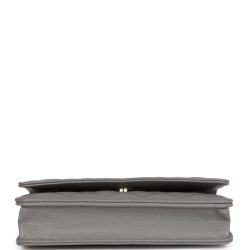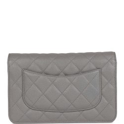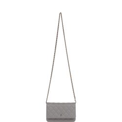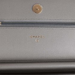 This Wallet on is of Grey with light tone hardware and has a front flap with emblem. half moon back pocket and long light tone and grey leather chain.