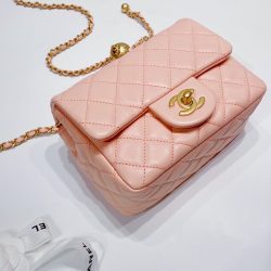 This is an authentic Mini Flap in Pink. The chic mini crossbody is crafted of soft leather in pink. The bag features an aged link leather threaded shoulder strap and a facing aged turn lock. This opens the flap to a leather interior with zipper and patch pockets.