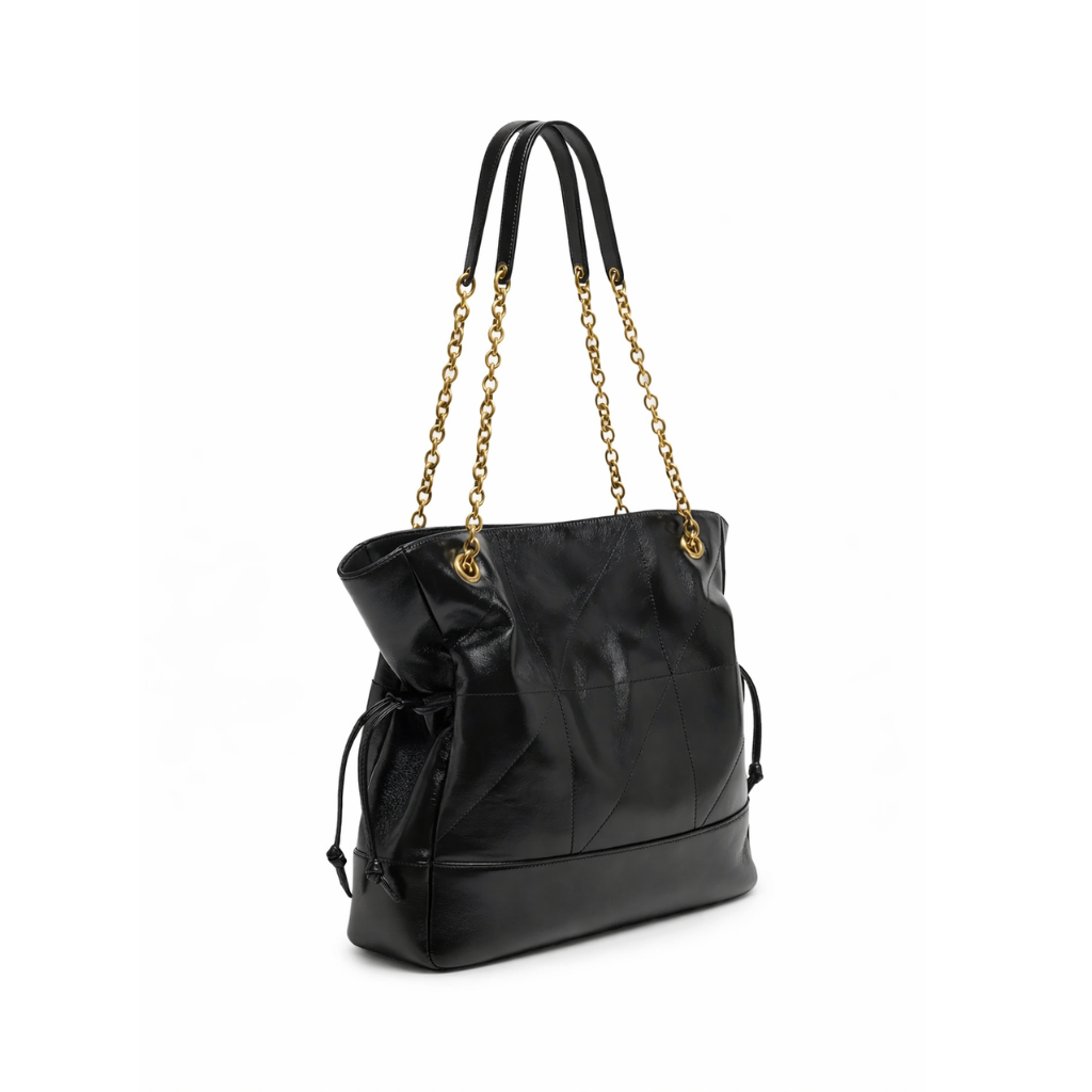 Featuring a sliding curb-chain strap, the bag may be worn on the shoulder.